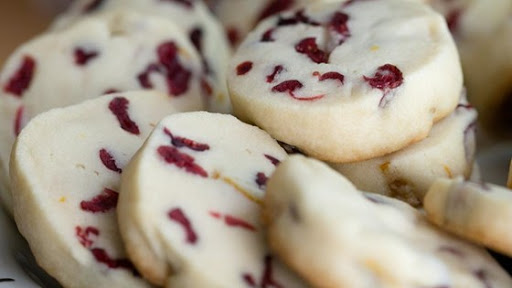 Combine flour, baking powder, and salt in a bowl; set aside. Beat the butter and confectioners' sugar with an electric mixer in a large bowl until smooth. Stir in the vanilla and almond extracts and orange zest. Mix in the flour mixture until just incorporated. Fold in the cranberries; mixing just enough to evenly combine.