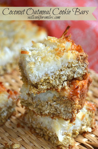 Coconut topping: Combine coconut flakes and sweetened condensed milk and a bowl. Using a fork, mix well until evenly Incorporated. Spread the coconut tipping evenly over the cookie dough.