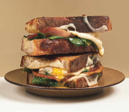 Meanwhile, heat skillet with drippings over medium heat. Crack eggs into skillet; cook until whites are set but yolks are still runny, 2 to 3 minutes. Set 6 pancetta slices and 2 eggs atop each of 2 cheese toasts. Top eggs with onion, Parmesan, and basil, then remaining bread slices, cheese side down. Cut sandwiches in half and serve.