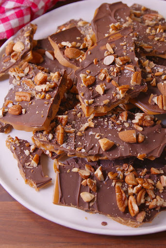 Pour toffee mixture onto a parchment-lined baking sheet and immediately top all over with chocolate chips. Let sit 2 minutes so chocolate begins to melt, then spread chocolate all over with a spatula to create a layer on top of toffee.