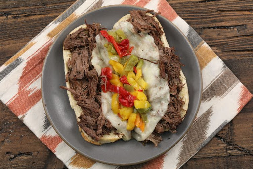 We recommend putting the meat on buns, then topping with cheese and putting the open-faced sandwich in the oven to broil for 1-2 minutes allowing the cheese to melt. Remove from the oven and finish off with roasted peppers.