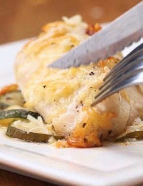 5. Lay the chicken on the zucchini, season with salt and pepper and spoon on the rest of the garlic butter. Top with parmesan.