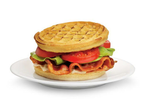 1. Waffle BLT Cook 2 slices bacon in a large skillet over medium heat, turning, until crisp, about 8 minutes. Remove to a paper towel-lined plate. Add 2 frozen waffles to the skillet and cook in the drippings until golden, about 1 minute per side. Stir together 1/2 tablespoon each mayonnaise and relish, and a dash of hot sauce; spread on 1 waffle. Top with the bacon, lettuce leaves and sliced tomato; season with salt and pepper. Top with the remaining waffle.