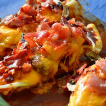 Pour bbq sauce over each breast. Top each with 2-3 slices bacon, shredded cheddar cheese then tomatoes and scallions. Sprinkle with garlic, salt and pepper.