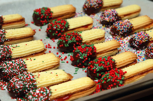 HAND PIPE THE DOUGH IN A PASTRY BAG WITH LARGE STAR TIP. BAKE ON PARCHMENT LINED COOKIE SHEETS AT 350 ABOUT 10 MINS. COOL AND SANDWICH WITH STRAWBERRY OR RASPBERRY JAM. THEN, DIP IN MELTED CHOCOLATE AND SPRINKLES!