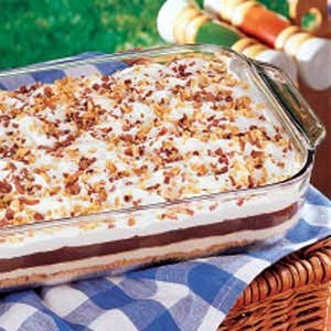 Just before serving, carefully spread remaining topping over the pudding layer. Sprinkle with grated chocolate and the remaining peanuts.