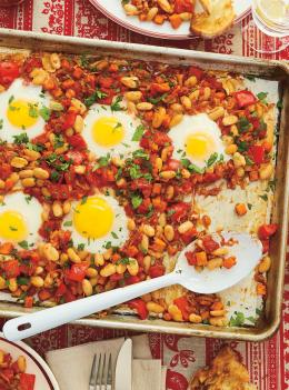 Retirer du four. Ajouter les haricots blancs et remuer délicatement. À l’aide d’une cuillère, creuser 6 puits dans le mélange de légumes. Y casser les œufs. Poursuivre la cuisson au four de 6 à 7 minutes ou jusqu’à ce que le blanc des œufs soit cuit.