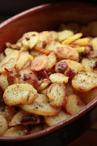 Add the remaining oil and butter to the pan and fry the potato slices over a low/medium heat, turning them occasionally. Allow them to brown lightly on one side before turning, repeating the process till most of the potatoes are golden brown.