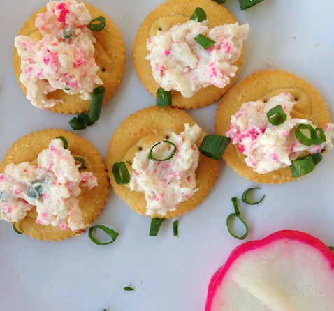 Dice, grate or shred the Kamaboko. Add softened cream cheese and mayo and mix well. Add in green onions and salt and pepper to taste. Serve with Ritz crackers.
