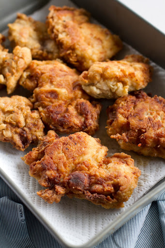 Dip chicken pieces in dry mix, then buttermilk, then again in dry mix