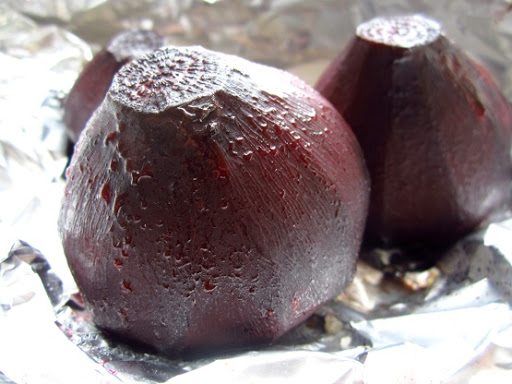 Wrap beets in aluminum foil, place on a baking sheet, and roast in the oven until cooked through, approximately 45 to 60 minutes.
