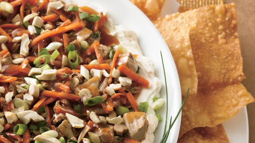 4. In medium bowl, beat cream cheese and milk with electric mixer on medium speed. Spread on serving platter at least 10 inches in diameter. Just before serving, spoon topping over cheese; drizzle with sauce, and sprinkle with cashews and green onions. Serve with crisp wontons.