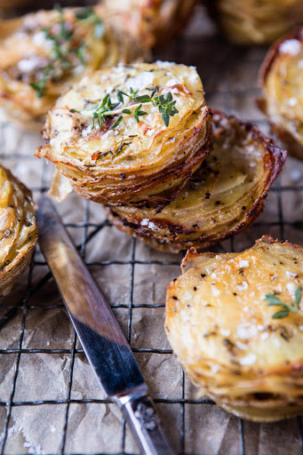Cover with foil and place on a baking sheet. Transfer to the oven and roast for 30 minutes. Remove the foil and continue cooking another 20-25 minutes or until the potatoes are tender and golden. Run a butter knife around the edges of the of each stack to release them. Serve immediately, sprinkled with a little sea salt.