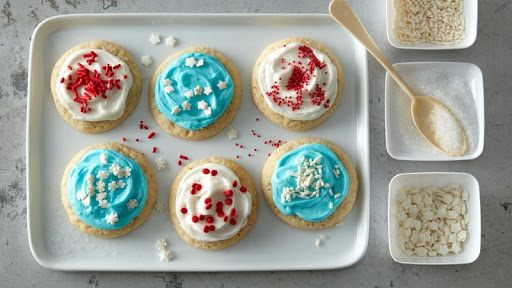 Meanwhile, in medium bowl, beat powdered sugar, 1/4 cup softened butter, 2 to 4 tablespoons milk and 1/2 teaspoon vanilla with spoon until smooth and fluffy. If frosting is too stiff to spread, add additional milk, 1 teaspoon at a time. Tint with food color. Using knife, spread slightly less than 1 teaspoon frosting on each cooled cookie; top with sprinkles. Store covered in airtight container at room temperature.