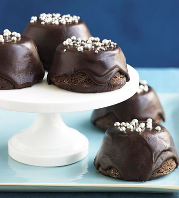 Place a rack over a jelly-roll pan. Place cakes, flat-side down, on rack. Pour 2 to 3 tablespoons ganache over each cake, smoothing with spatula. Refrigerate 1 hour or until set, and decorate, if desired. If using silver dragees, remove before eating.