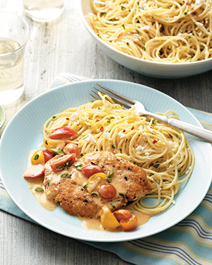 Off heat, deglaze pan with vodka and cook until liquid evaporates. Add broth and cream and reduce until thick, 2–3 minutes. Stir in tomatoes and lemon juice and bring to a simmer. Return cutlets to pan and cook to warm through, 1 minute per side.