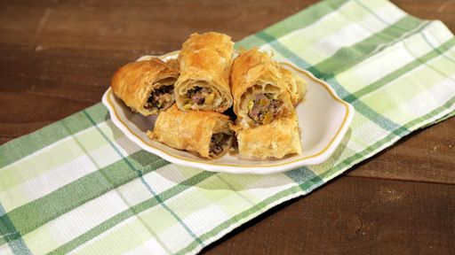 On a cutting board dusted lightly with flour, lay out one sheet of puff pastry and roll it out to an 11x11-inch square. Cut the rectangle in half. Take 1/4 of the sausage mixture and place it on one piece of the puff pastry. Roll and form it into a log. Place on the baking sheet and brush the seam farthest away with egg wash. Roll tightly to seal and place seam side down on the baking sheet. Repeat with the remaining pastry and filling.