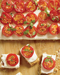 Meanwhile, in a large bowl, toss the tomatoes with the olive oil and 2 teaspoons of thyme and season with salt and pepper. Place the tomatoes on a baking sheet, cut side up, and bake on the upper rack for about 15 minutes, until softened slightly. Let cool.