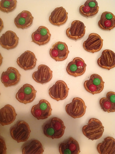 - 1 Pecan half OR 2 m&m's (1 green / 1 red) or 1 Small pretzel (same size as above)