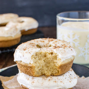 Whisk together the powdered sugar and eggnog until creamy. Spread on the tops of the cooled donuts using a metal spatula. The glaze sets up quickly so sprinkle the tops of the donuts with nutmeg as soon as you add the glaze to each one. Let the glaze set completely before storing in a tightly sealed container.