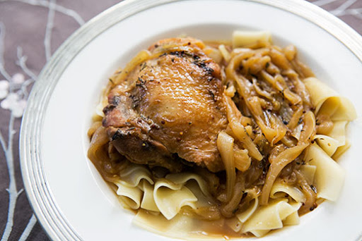 The chicken skin has likely rendered quite a bit of fat. Drain off all but 2 tablespoons of fat from the pan, taking care to not discard any of the tasty browned bits. (Note, do not discard the fat down the drain, you may clog your plumbing. Pour off into a jar.) Lower the heat to medium and add the sliced onions to the pan. If you want, sprinkle brown sugar over the onions. This is optional. The added sugar will intensify the natural sweetness of the onions. Cook the onions slowly, stirring occasionally, until they begin to brown, about 15 minutes.