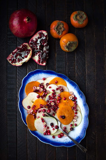 Layer the pears, apples and persimmons on a serving dish, and scatter the pomegranate arils and cranberries over them.