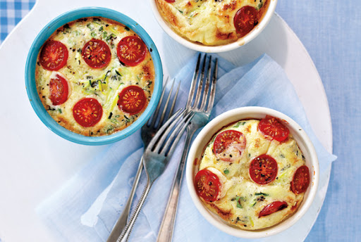 Divide goat cheese evenly among ramekins; top each with one-quarter of the zucchini mixture and one-quarter of the egg mixture. Top each with 6 cherry tomato halves.