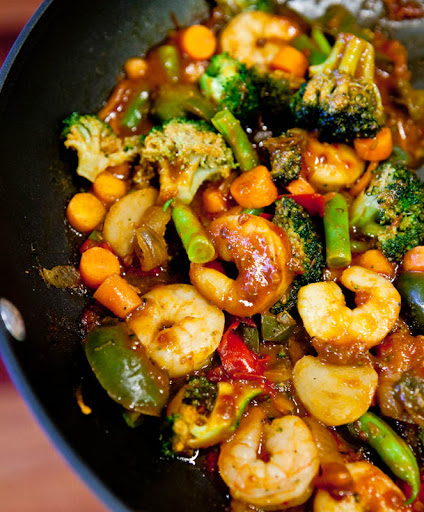 Combine all ingredients in a wok or large skillet and cook for 4 to 6 minutes or until shrimp are done (opaque) and vegetables are tender. Serve immediately or quickly make fried rice.