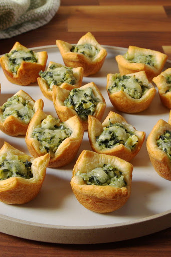 Flour your work surface, roll out crescent dough, and pinch seams together. Cut into 24 squares. Place squares into muffin tin slots and spoon 1 tablespoon of dip into the dough.Top with remaining mozzarella.