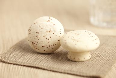 9. Place the cocoa powder in a sifter, and lightly sift cocoa over the tops of the mushrooms. Mushrooms can be stored for up to a month in an airtight container in a cool, dry room. Note that humidity can make the mushroom soft and collapse, so do not place them on a cake or in a refrigerated environment until immediately before serving.