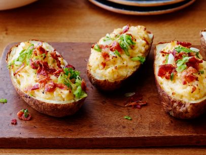 Cook Notes: I learned the hard way not to wrap the potatoes in foil before baking. It softens the shells and they will fall apart not good! Baking them unwrapped makes the shells stronger for scooping out the potato flesh later.