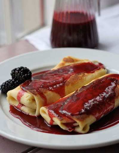 Place blintzes in a 9×13 baker and bake in a 400º oven for 12 minutes to finish cooking the filling. Serve with blackberry sauce.