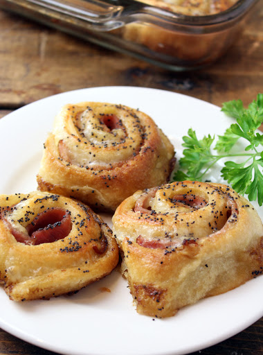 Layer crescent sheet with ham and top with Swiss cheese. Roll into log, starting with long side. Cut into 12 sections. Place in a 9x13 baking dish, face-up. Cover with sauce mixture.