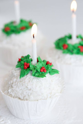 Place the red icing in a piping bag fitted with a coupler and a small round tip, like Tip #2 or #3 and the green icing in a bag fitted with a leaf tip, like Tip #67. Remove the hardened “snowball” from the freezer and pipe a ring of leaves in a wreath pattern around the top. You may want to use a circular object like a cookie cutter or a clean cap to make a slight circular indentation in the ice cream to follow. The leaves should be fairly small and facing in different directions to give the holly wreath some texture. Finish the wreath by piping several clusters of three small red “berries.” Place a candle in the center of the wreath and return to freezer