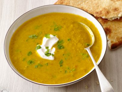 Mix the yogurt with 2 teaspoons water and a pinch of salt in a small bowl. Ladle the soup into bowls and top with the yogurt and more cilantro. Serve with naan.