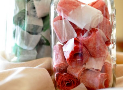 Spread thinly on parchment paper lined trays. Place in dehydrator until dehydrated, yet still pliable. When done, roll up parchment paper with fruit leather and cut into desired size pieces.