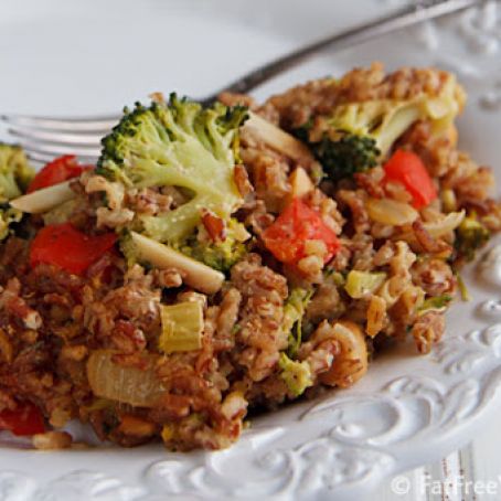 4.While the broccoli is steaming, heat a large, deep non-stick skillet or saute pan. Add the onion, bell pepper, and celery and cook, stirring constantly, for 4-5 minutes. Stir in the chickpeas, thyme, rice, and steamed broccoli. Make sure the sauce is well-blended, and add it to the skillet. Stir gently and cook until heated through, about 5 minutes. Check seasonings, adding more salt and pepper if necessary, and smooth into the prepared casserole dish and sprinkle with almonds, if desired. Bake until the top begins to brown, about 20 minutes. Serve hot.
