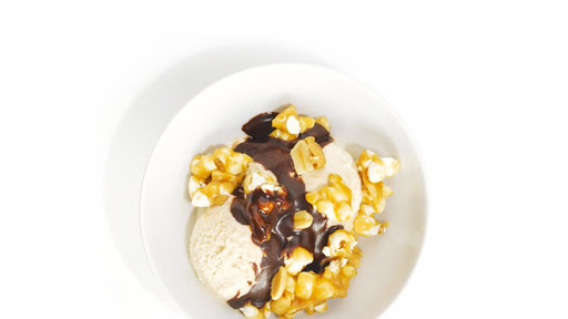 Serve ice cream topped with popcorn crunch and fudge sauce.