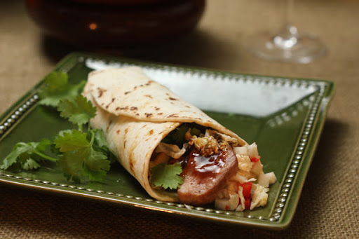 Think of this recipe, then, as Peking Duck Light. (That’s light on procedure, not on flavor.) You use the same kind of duck, but the breasts only and you sauté them, which only takes about 15 minutes. (The skin won’t turn out quite as crispy as if you roasted it, but it’s plenty crispy enough.) The Asian-style cole slaw with which I’ve supplemented the classic recipe provides acidic contrast to the sweet hoisin and fatty skin. Roll it all up in my cheating non-homemade pancakes (aka flour tortillas) and you have a feast in every bite.
