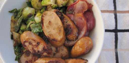 Add your piece of bacon that has been cut in half to the pan. As soon as the fat begins to render out into the pan, add the sliced chicken sausage.