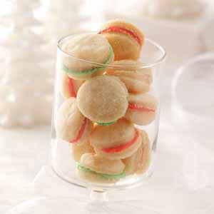 In a small bowl, combine the butter, confectioners' sugar, vanilla and enough cream to achieve desired consistency. Remove half to another bowl; tint one portion of filling with red food coloring and the other half with green. Carefully spread filling on bottom of half of the cookies; top with remaining cookies. Yield: 2 dozen.