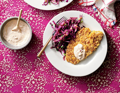 Tortilla-Crusted Tilapia with Citrus Slaw and Chipotle Tartar Sauce