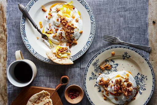 Turkish-Style Poached Eggs with Garlic Yogurt, Chili Flakes & Walnut Butter