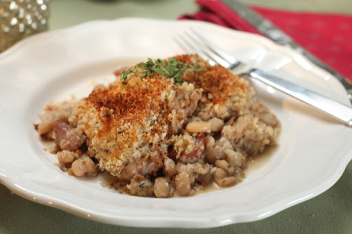 4. Return the chicken to the skillet along with any juices that have accumulated on the plate. Add the kielbasa, chicken stock, both the mashed and the whole beans, and the mustard; bring the mixture to a simmer. Cover the pan and simmer 15 minutes, or until the chicken has just cooked through. While the chicken is cooking preheat the broiler.
