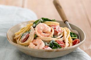 Drain pasta; place in large bowl. Add spinach; mix lightly. Add shrimp mixture; toss to coat.