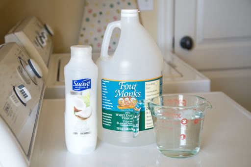 Mix hot water and conditioner together in medium bowl. (The hot water helps smooth any clumps from the conditioner). Mix in vinegar and pour in container of choice. Use the same amount as you would a store bought softener and add to the regular softener spot in your washer or during the rinse cycle.