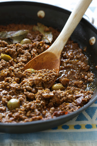 Add to the meat and continue cooking on a low flame. Add alcaparrado and about 2 tbsp of the brine (the juice from the olives, this adds great flavor) cumin, bay leaf, and more salt if needed. Add tomato sauce and 1/4 cup of water and mix well. Reduce heat and simmer covered about 20 minutes.