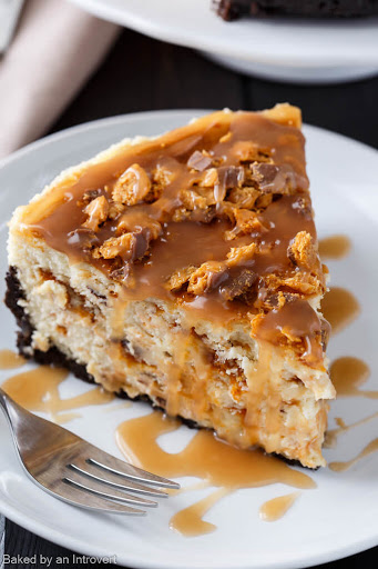 Just before serving, top the cheesecake with the remaining candy bar and drizzle with homemade caramel sauce.