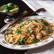 Our version of pad thai, the satisfying rice-noodle dish from Thailand, is made with chicken, tofu, bean sprouts, and, in place of hard-to-find rice noodles, linguine. The fish sauce is available at Asian markets and keeps forever. If you like, you can use a mixture of soy sauce and oyster sauce instead. Lime wedges make a nice final touch.