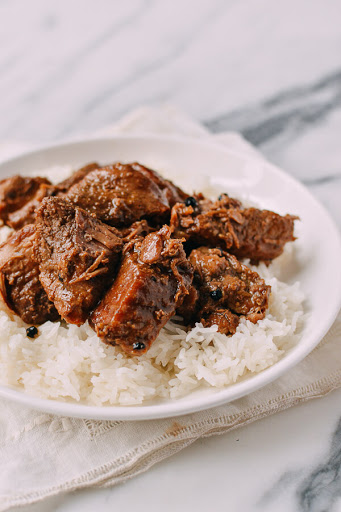 Add the vinegar, soy sauce, garlic, bay leaf, peppercorns, sugar, and water, and bring to a boil. Reduce the heat to medium low, cover, and simmer for 1 hour. Remove the cover and continue simmering for another 30 minutes to reduce the sauce.